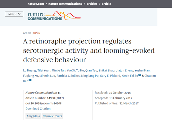 该研究发现视网膜内存有一类可同时投射至上丘(SC)和背侧中缝核(DRN)的神经节细胞,而且它们能够特异感知并传递迫近性威胁刺激(Looming stimulation)。当该类细胞激活时,一方面可通过启动上丘(SC)—丘脑外侧后核(LP)—杏仁核(Am)神经通路来诱发防御反应,另一方面还可通过抑制DRN的五羟色胺(5-HT)神经元进而保证防御反应的顺利执行。