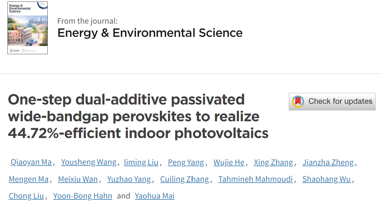 必威平台_必威(中国)一站式服务平台,融媒体中心讯 近日,物理与光电工程学院新能源技术研究院在能源领域顶级期刊Energy & Environmental Science(影响因子:32.5)上发表题为“One-step dual-additive passivated wide-bandgap perovskites to realize 44.72%-efficient indoor photovoltaics”的最新研究成果。