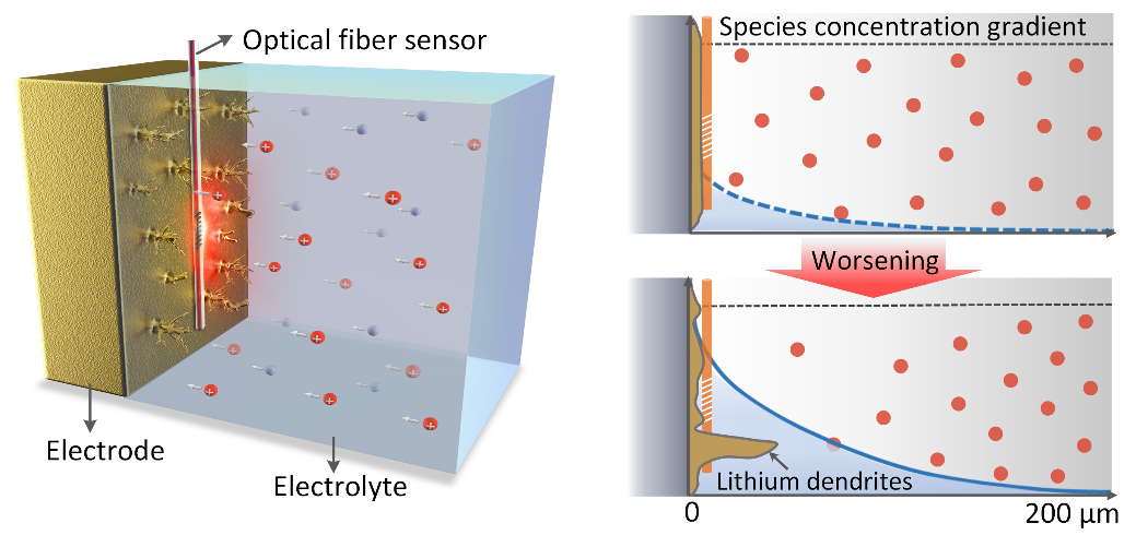 为攻克这一科学难题,团队提出了一种可植入锂金属电池内部的光纤电化学原位监测技术。在不影响锂电池正常运行的情况下,实现了纳米尺度下锂离子传质动力学过程和锂枝晶的生长状况的原位、实时、精准监测。团队通过植入的倾斜光纤布拉格光栅(TFBG)传感器,厘清了锂金属电池枝晶生长规律,精确量化了传质速率由非稳态过渡到稳态的动态变化过程,揭示了不同输运机制条件下(如离子导体、电子-离子混合导体和电子导体),人工固态电解质界面膜(SEI)对锂枝晶调控机制的特征规律,为明确锂枝晶的生长机制提供了重要依据。基于上述测量手段,团队进一步提出了综合评估SEI调控膜的新方法,为设计长寿命和高安全性的锂金属电池提供了新的思路。