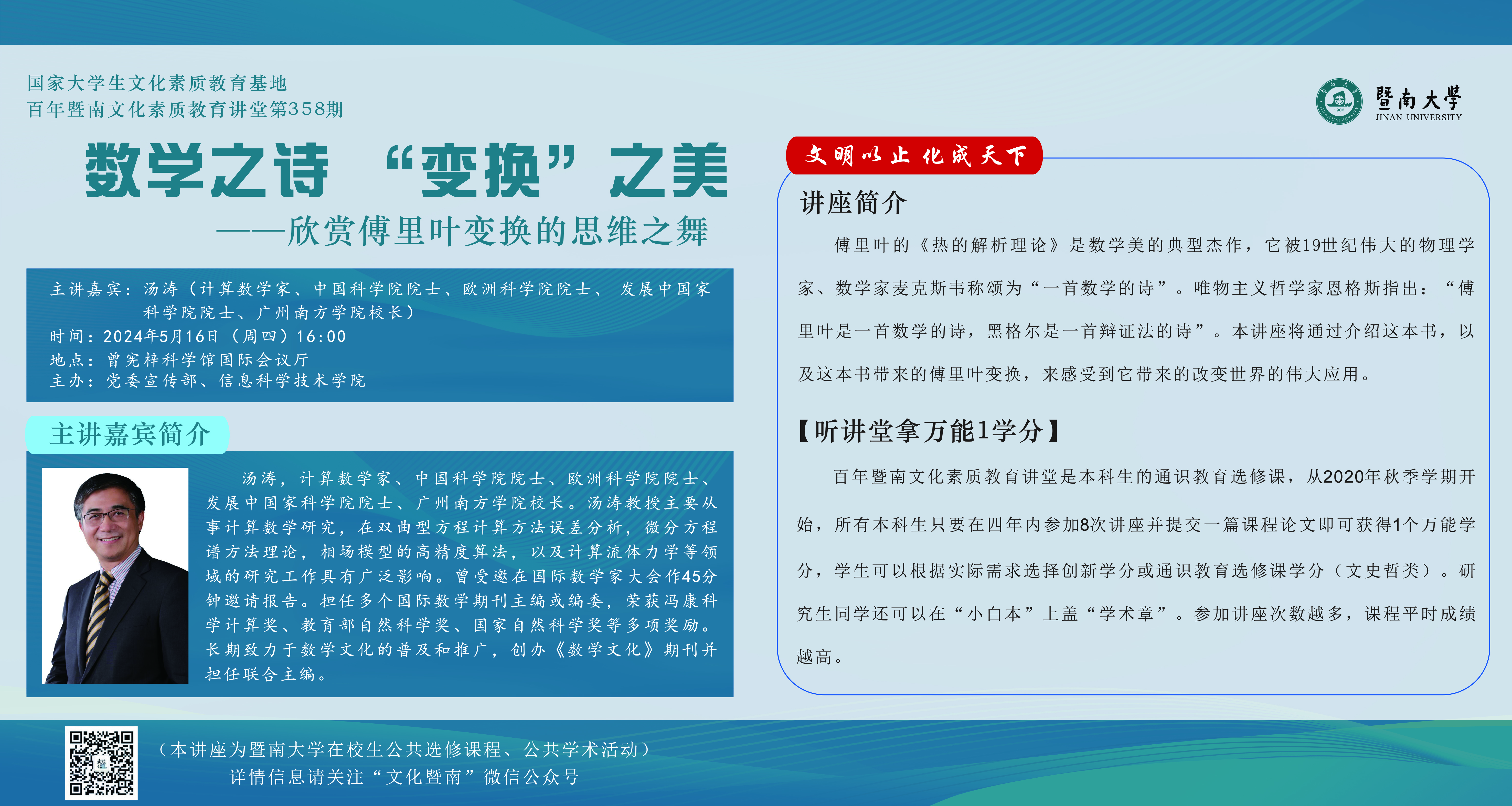 百年暨南文化素质教育讲堂第358期:中国科学院院士汤涛:数学之诗 “变换”之美——欣赏傅里叶变换的思维之舞