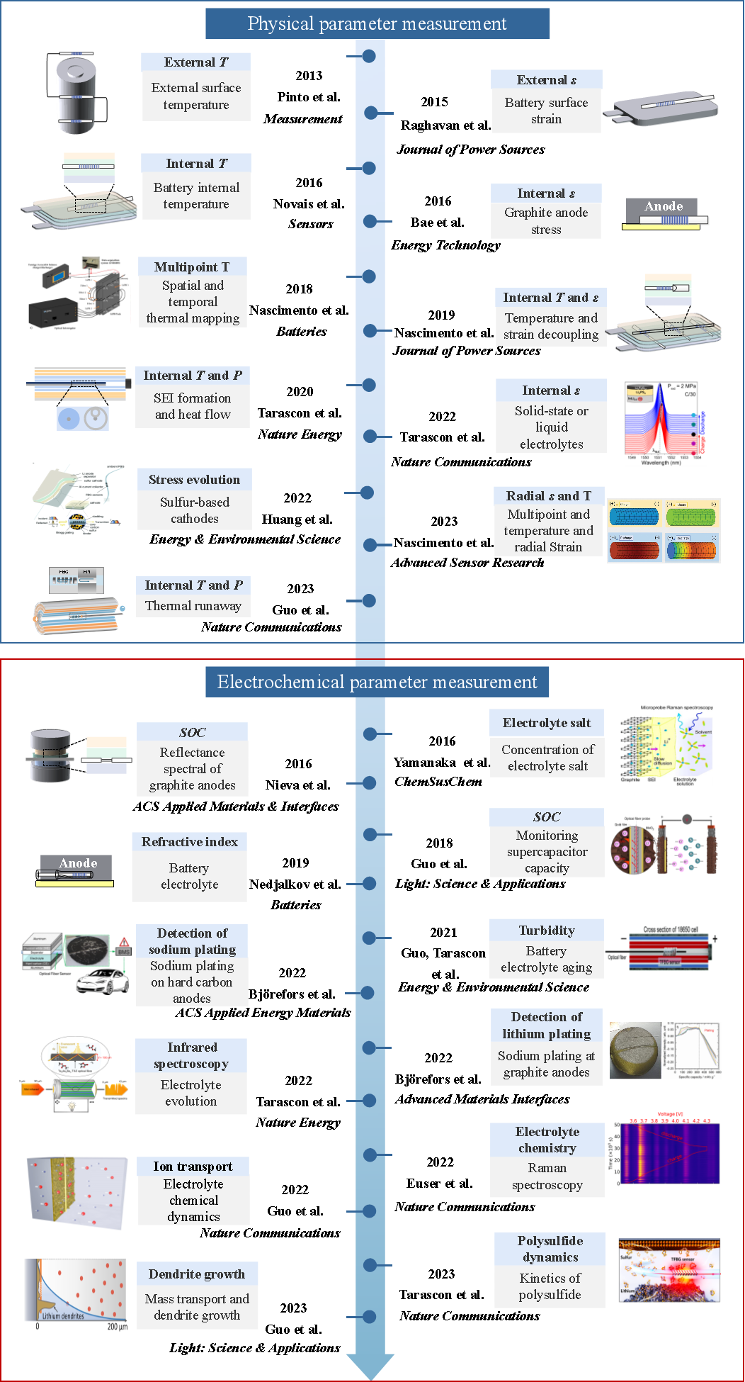 可再生能源是人类持续发展的基础,电池(锂离子电池、氢燃料电池等)是可再生能源高效利用的核心。探究电池工作新机理、发现电池微观反应新现象、提升电池功率密度与能量容量新效能,是科研人员不断努力的方向。当前,电池外部物理量监测手段已经不能满足人们对电池更大能量密度、更长使用寿命、更高安全运维水平的需求,电池内部物理、化学、电化学参量的原位、实时、精准监测成为世界各国研究的热点。