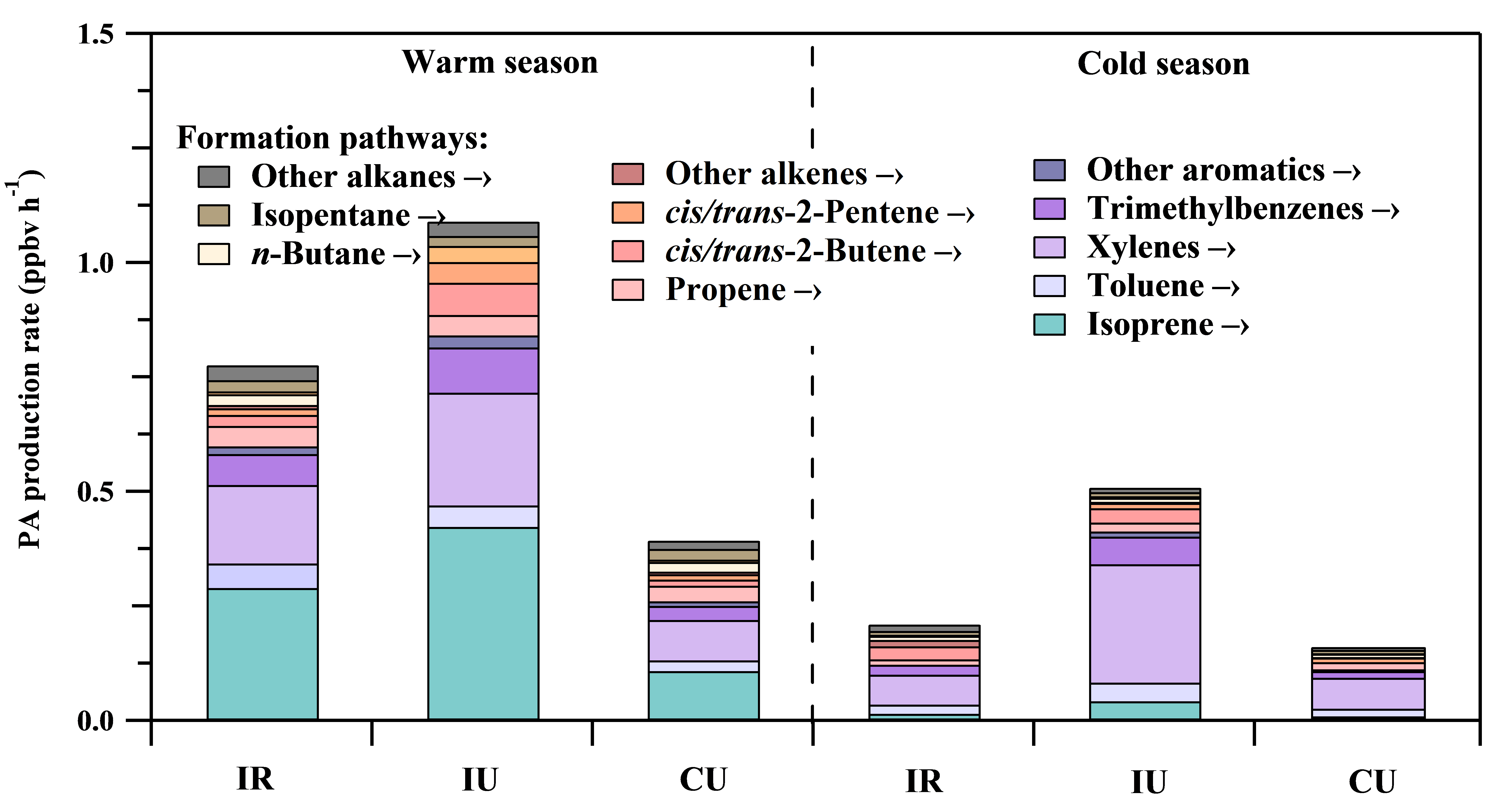 (图3 VOC物种对珠三角内陆郊区(IR)、城区(IU)和沿海城区(CU)PAN生成的贡献)