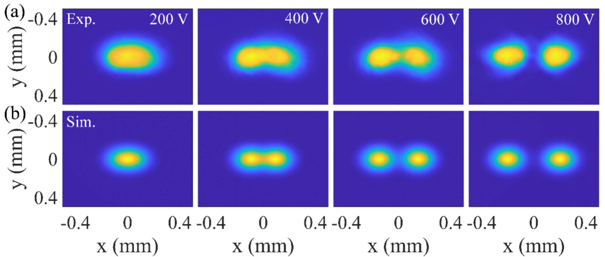 图2.极化光子的斯特恩-盖拉赫效应:不同人工磁场梯度下(由电压描述),实验观察到极化光子的分裂。(a)实验结果;(b)理论结果。