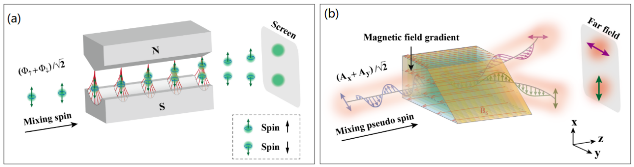 图1.电子(极化光子)斯特恩-盖拉赫效应原理图。(a)一束传播中的原子在空间非均匀磁场作用下逐渐分裂成两束,对应于电子自旋向下和向下两种量子化状态;(b)一束传播中的极化光子在空间非均匀人工磁场作用下逐渐分裂成两束,对应于极化光子的水平偏振和垂直偏振态。