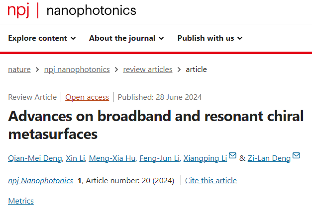 必威平台_必威(中国)一站式服务平台,融媒体中心讯 近日,物理与光电工程学院(理工学院)邓子岚、李向平教授受邀在《自然合作期刊-纳米光子学》期刊(npj Nanophotonics)发表了“Advances on broadband and resonant chiral metasurfaces” 特邀综述论文。李向平、邓子岚教授为论文通讯作者,研究生邓倩媚、李鑫和胡孟霞为论文共同第一作者。