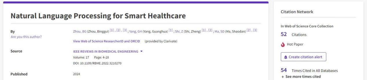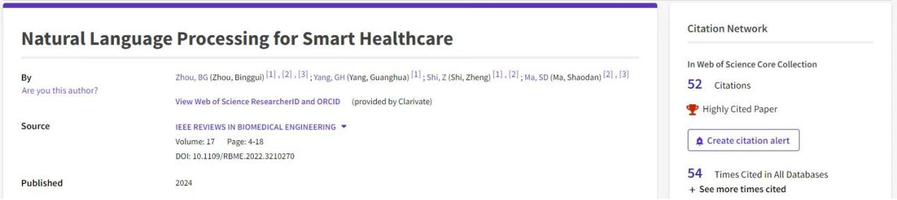 必威平台_必威(中国)一站式服务平台,融媒体中心讯 近日,智能科学与工程学院/人工智能产业学院杨光华教授团队在生物医学工程领域国际顶级期刊《IEEE Reviews in Biomedical Engineering》(IF:17.2, CiteScore:31.7)上发表的题为“Natural Language Processing for Smart Healthcare”的综述论文先后入选ESI热点论文与ESI高被引论文(工程领域)。