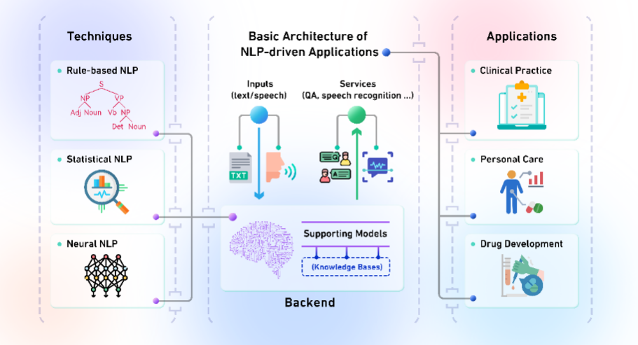 该篇论文回顾了自然语言处理在智慧医疗领域的技术发展,详细归纳了自然语言处理技术在临床决策支持、医院管理、公共卫生、药物研发等多个医疗场景中的应用,进一步总结了自然语言处理技术在两个近年来备受关注的医疗问题(新型冠状病毒肺炎疫情与心理健康)中的重要作用,研究团队还就自然语言处理技术的可解释性、端到端应用、小样本学习等方向展开讨论,指出了现有研究的局限性与未来研究的潜在方向。