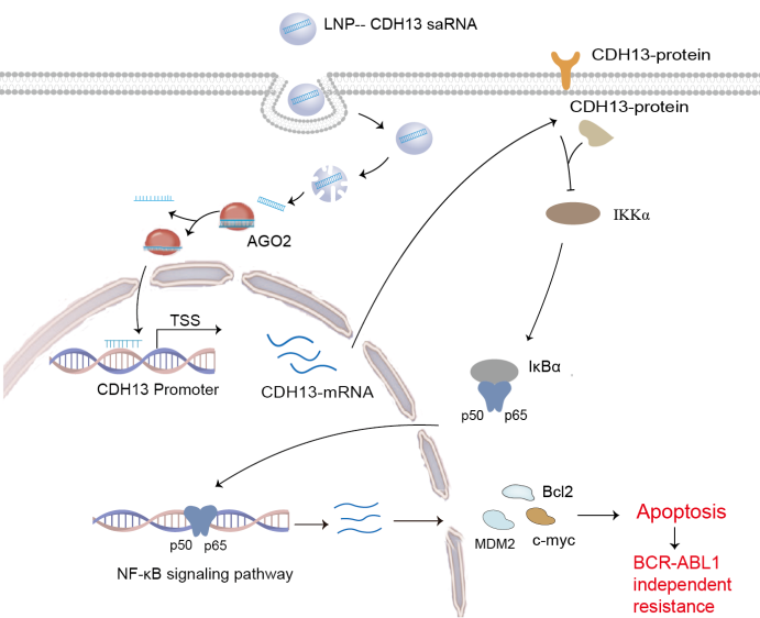 费嘉教授该研究团队利用CDH13-saRNA靶向激活CDH13的表达,抑制CML耐药细胞中NF-κB信号通路传导,促进凋亡的发生,为克服CML BCR-ABL1非依赖性耐药提供一种新的可行性方案。