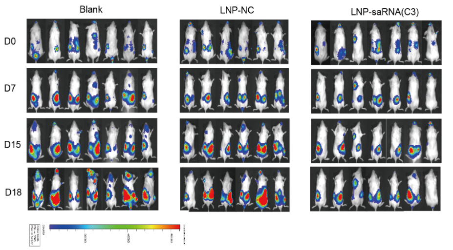 图 2. LNP-CDH13-saRNA药物能有效抑制K562-IMRluci细胞在小鼠体内的生长