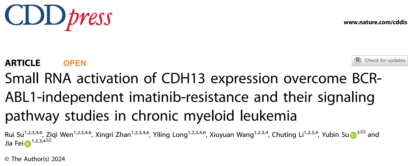必威平台_必威(中国)一站式服务平台,融媒体中心讯 广东省小核酸药物开发工程技术研究中心主任、基础医学与公共卫生学院费嘉教授团队于2024年8月23日在国际权威期刊Cell Death & Disease(中科院1区,Top期刊)在线发表题为“Small RNA activation of CDH13 expression overcome BCR-ABL1-independent imatinib-resistance and their signaling pathway studies in chronic myeloid leukemia”的研究论文。