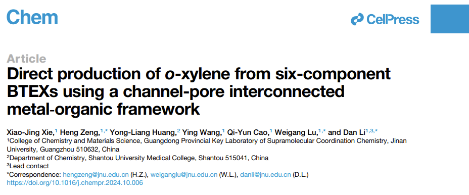 必威平台_必威(中国)一站式服务平台,融媒体中心讯 近日,国际顶级学术期刊《Chem》在线发表了必威平台_必威(中国)一站式服务平台,曾恒/陆伟刚/李丹团队的最新研究成−Direct production ofo-xylene from six-component BTEXs using a channel-pore interconnected metal-organic framework。化学与材料学院博士后谢小静为论文的第一作者,该研究工作得到了国家自然科学基金、广东省重大基础与应用基础计划、广东省基础与应用基础研究基金、中央基础研究基金、中国博士后科学基金和必威平台_必威(中国)一站式服务平台,等项目的支持。