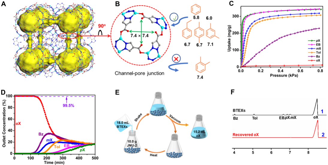 苯衍生物的分离被认为是改变世界的七种关键化学分离技术之一。苯及其衍生物,包括苯(Bz)、甲苯(Tol)、乙苯(EB)、对二甲苯(pX)、邻二甲苯(oX)和间二甲苯(mX),统称为BTEXs,属于重要的石化工业原料,广泛应用于聚合物、塑料、纤维和燃料添加剂等化学品的生产。其中,用于邻苯二甲酸酐制造的oX市场规模在2025年预计超过43亿美元。当前,工业上采用分馏法从BTEXs中分离oX,但该方法需要大量的理论塔板数(>150)和高回流比才能获得高纯度的oX,这个过程耗能巨大,设备结构复杂,且资本投入高昂。基于多孔材料的吸附分离技术因其低能耗、高效率、操作简便及成本较低,被视为一种可替代的分离方法。而金属有机框架(Metal−Organic Frameworks,简称MOFs)作为一类由有机配体和金属离子通过配位键自组装形成的晶态多孔材料,因其具备高度可调的孔形状、孔尺寸及表面化学性质,被认为是应用于复杂碳氢化合物分离的理想吸附剂。尽管目前已有众多研究报道了MOFs材料在分离oX与其他C8异构体方面的潜力,但由于BTEXs各组分的物化性质相似,构建能够在多组分体系中实现单一组分高选择性分离的MOFs材料仍然面临巨大挑战。