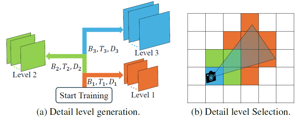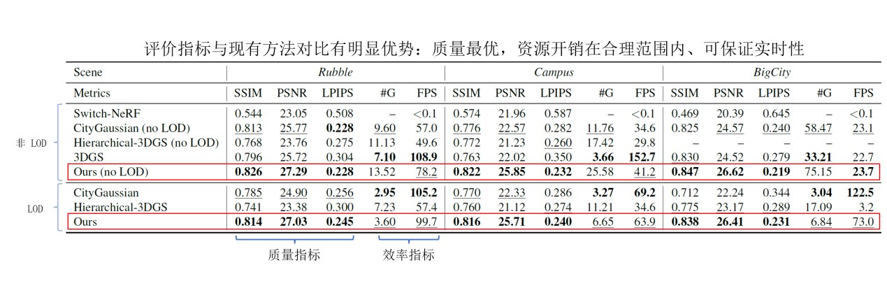 分区优先的资源动态分配机制:提出创新的分区内资源优先调度策略,在显著降低显存占用的同时提升重建速度;同时提出了可控细节层次(Level of Detail,LOD)生成策略,实现自底向上的多尺度建模,确保城市级场景的实时渲染性能。