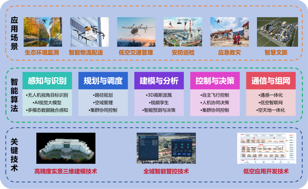 研究致力构建低空经济数字基础设施。依托城市级实景三维重建技术,团队成功研发了“低空经济数字底座”。通过“关键技术-智能算法-应用场景”三位一体的创新架构,打造面向未来的低空经济数字基础设施。