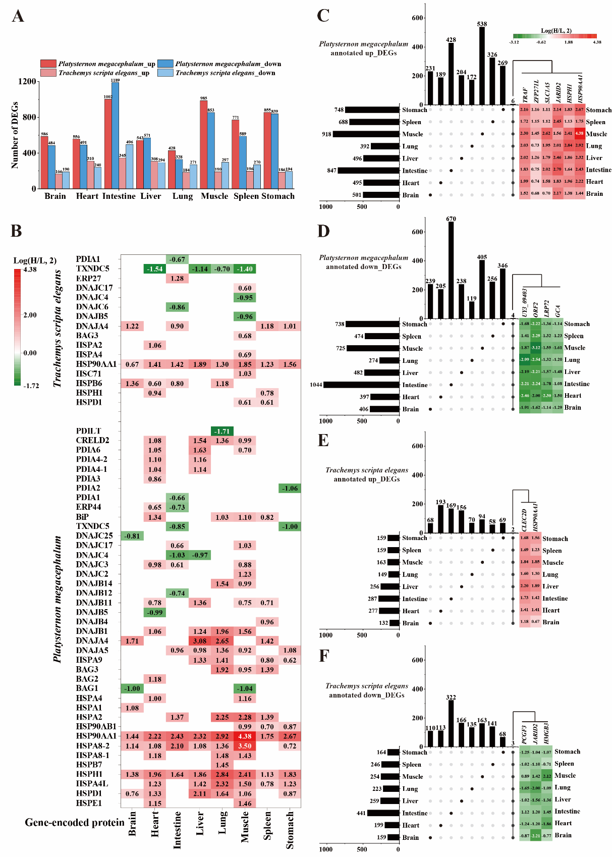 图1.平胸龟和红耳龟在高温下各组织器官的差异表达基因