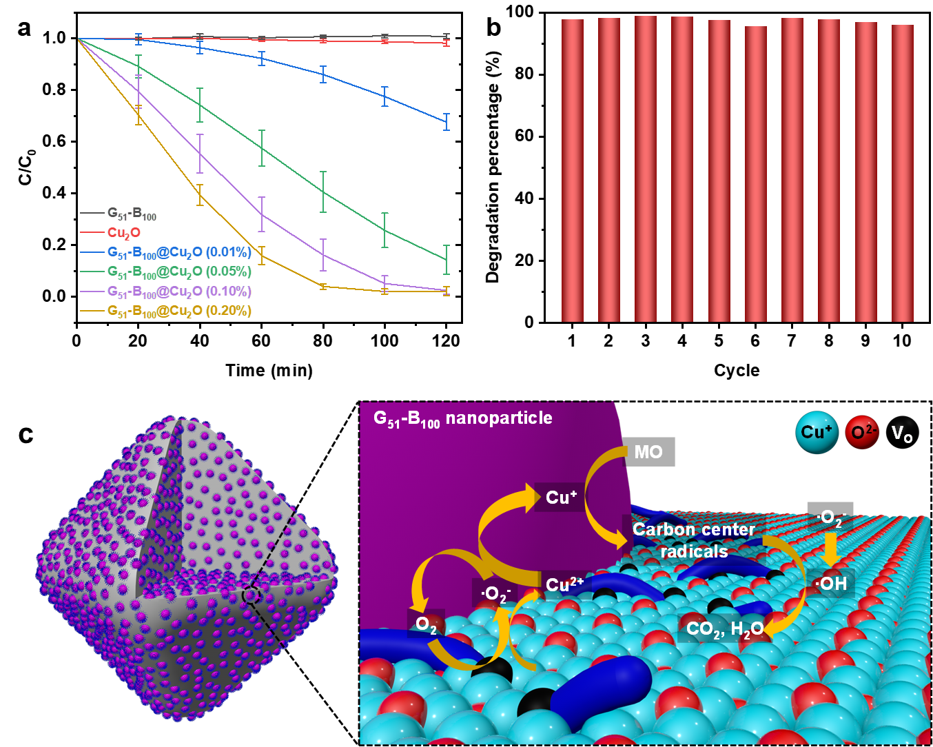 催化实验表明,由于氧空位的产生,G51-B100@Cu2O复合晶体能够在无光条件下降解甲基橙(MO)染料,并且其活性与纳米粒子内嵌程度呈正相关。而在相同条件下,纯Cu2O晶体或单独的G51-B100纳米粒子均未表现出降解能力(图6)。此外,该复合晶体在十次循环后仍保持95%以上的降解效率,展现出了优异的循环能力(图6)。
